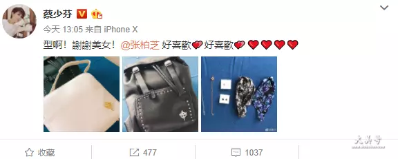 蔡少芬写道"型啊!谢谢美女!张柏芝好喜欢好喜欢",连用两个"好喜欢"表达溢于言表的喜悦之情。