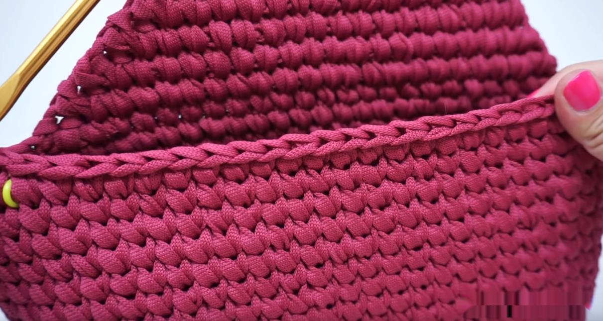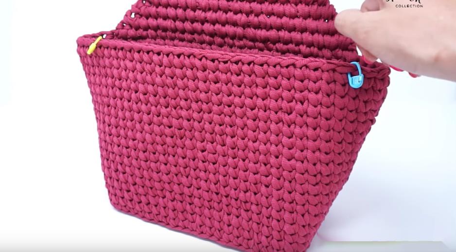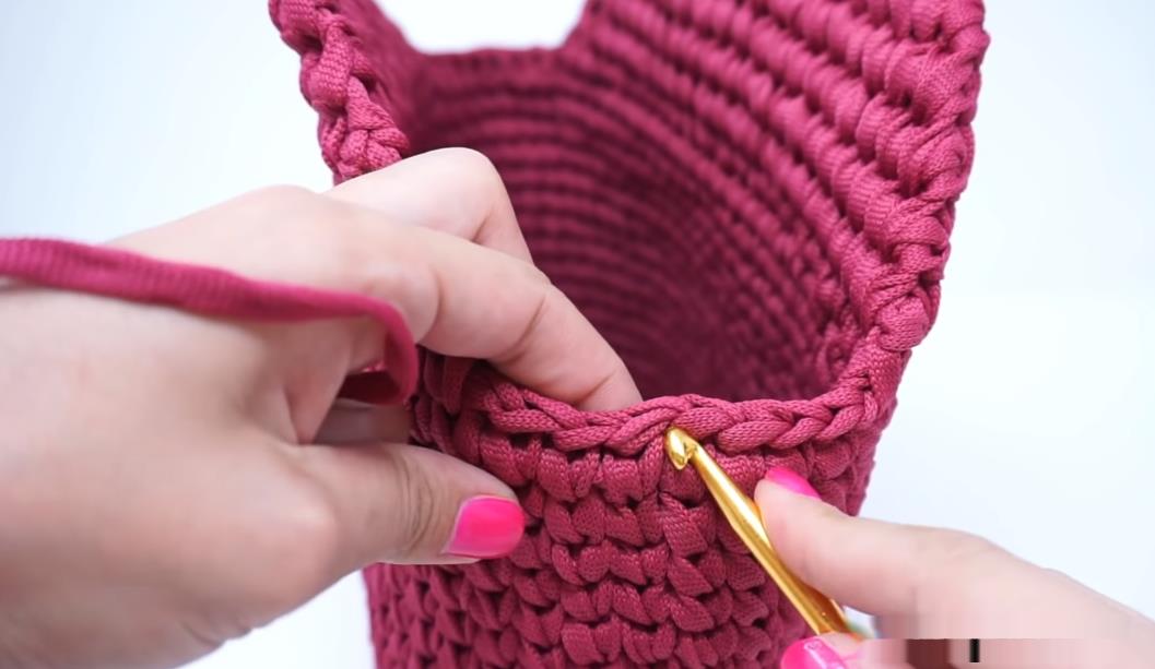 接着我们要将整个包口挑一圈包。从包侧边中间2针的左边1针入针,包包的横段部分都是不加不减钩短针,斜侧边部分每1行钩1针引拔针,转角处我们都用1针锁针来过渡,最后1针用缝针收针。