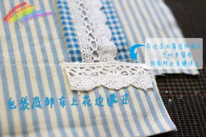 缝份留多些, 比如4cm宽的带子,缝份各留1.5到2cm,单面带胶铺棉剪好熨到布上。 反过来用布用双面胶,折起来熨好。 中间空隙部位也用布用双面胶熨上足够宽的花边。车缝两道直线, 既起到了装饰效果, 又达到了压线固定效果。一举两得。