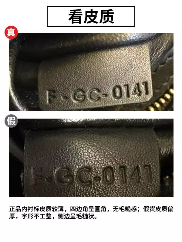 正品内衬标皮质较薄,四边角呈直角,无毛糙感;假货皮质偏厚,字形不工整,侧边呈毛糙状。
