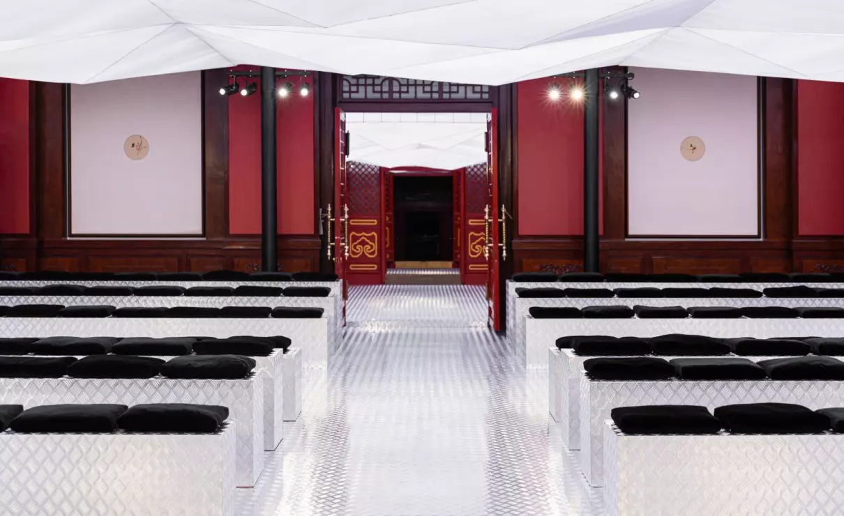 搭建秀场过程中,普拉达和AMO建筑事务所合作,在保留郡王府历史特征的基础上,尽量还原米兰秀场的未来感。具体表现为,普拉达在走秀场地铺设了一层银色的金属地面,并用几何形的顶灯来串联举办秀后派对的院落。