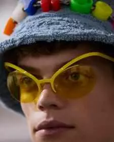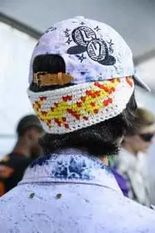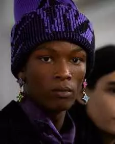 便帽通体由玻璃珠制成、手工钩编Monogram花卉图案和串珠流苏,或以针织三点式造型拼接而成。渔夫帽搭配宽幅鞋带状帽绳,帽绳饰有树脂玩具串珠,串珠绘有路易威登字母和数字;其他渔夫帽取材扎染毛皮。大量彩旗装饰化身围裹全身的配饰。帽子饰有巨幅刺绣图案,呈现扎染和砂洗效果,或全手工点缀十字绣和串珠。眼镜的设计灵感源自卡通动画中的蜻蜓、大黄蜂等昆虫形象。全新Four Motion眼镜增添防雾细节,配备鼻托调整器和镜腿延长配件。Evidence太阳眼镜推出全新Futurama版本,呈现本系列橡皮泥图案,Millionaire太阳眼镜推出全新橡皮泥配色。毛毡礼帽的帽带缀有人物玩偶,令礼帽显得尤为宽大。皮革手套饰有压印线式花纹,呼应本系列中巴黎宫廷天花板的飞檐图案。发带采用手工钩针工艺,呼应本系列多彩色调。
