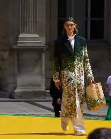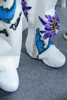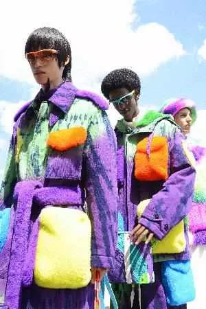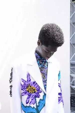 路易威登花卉图案由手工钩编工艺织就,或缀于西服袖口,或以拼贴形式装饰棒球夹克、飞行员夹克和衬衫。牛仔服装设计融入彩虹Monogram提花、提花水洗效果和做旧叠印效果,还有一款巴黎照片蒙太奇印花,饰于拔染牛仔单品。花田图案旨在致敬法国印象主义,其表现形式为:渐变图案织锦雪尼尔大衣、通体饰以同款刺绣图案的羽绒夹克。或以印花形式呈现于桑蚕丝绉绸刺绣垂坠睡衣,或以梭织形式点缀针织上衣。精致绞染工艺再现路易威登花卉logo。锯齿状边缝为加长的手帕卷边夹克、长裤和短裤的饰边增添优雅气息,同时致敬西装剪裁工艺和儿童手工艺术。精裁长袍配有肩垫,侧边开合,优雅得体又舒适。