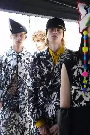 针织单品诠释本季主题,表现形式为:绘有蓟花、卡通和拼图图案的厚实套头衫,由多色小绒球包裹的纱线上衣,绘有花田图案的针织上衣。运动元素呈现于绘有朦胧感彩虹图案的拉丝马海毛橄榄球马球衫,出现在饰有嵌花点缀和保护性滑板衬垫的精致尼龙和美利奴上衣,以及空气锦纶纺纱的挺括蓬松透明套头衫中。线式花纹嵌线使用联想到巴黎宫殿的天花板,如今再现于白色皮革束腰夹克和白色皮革大衣上。多钮洞精裁西服可搭配任意造型,呈现具有垂坠感的弧形线条。纸飞机以皮革形式呈现,全幅点缀正统西装,旨在致敬贯穿本系列的童年主题。