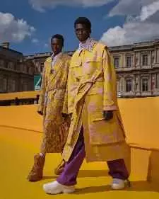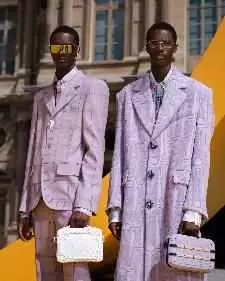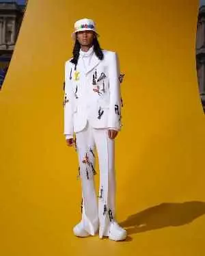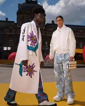 扎染工艺再次作为路易威登经典元素,呈现在工装、西服套装上的瓷砖和蓟花图案。路易威登花卉图案借由绞染工艺悉心勾勒,绽放于蕾丝衬衫的Damier图案上。瓷砖图案寓意巴黎宫廷地板,借由扎染工艺与蓟花图案共同呈现于剪裁精良的西服套装上。工具箱及工具图案致敬创造与治愈,或以平面和3D刺绣形式呈现于衬衫和西服套装,或以刺绣垂饰形式呈现于西服套装、工装和针织衫。工装廓形借鉴20世纪90年代滑板社群的经典着装。