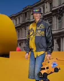 玩具承载着想象力,孩童时期的玩具最终成为梦想与抱负的基石。卢浮宫方形广场正中设有巨型儿童玩具赛车轨道,宛如放大数倍的游乐场,黄砖铺成的赛道承载无垠的想象力:心灵进化之路,童真幻想在此复苏。本系列展现了从童真到成熟的转变,借由路易威登精湛工艺升华童年意象。秀场布景的整体轮廓由大量弧线构成,巧妙运用代表“童年衣橱”的微缩尺寸与代表“成年衣橱”的巨型尺寸,并致敬20世纪90年代传统滑板社群的着装规范。游乐场中标志性的元素用以点缀服装和配饰:折纸飞机、积木串珠、橡皮泥的质感及色调、卡通印花和挖沙工具饰件。这些作品唤起了游乐场中发现的玩具以及成长过程中固有的情感。
