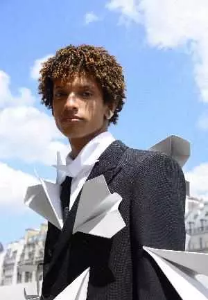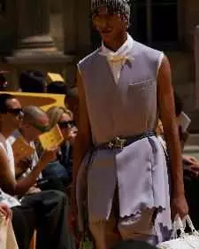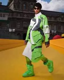 半身裙诠释优雅气质与硬朗风范:取材细棉布的层叠褶边半身裙,嵌花皮革越野摩托半身裙和极具浓郁工装气质的半身裙。横款足球、篮球和棒球的运动衫被改造成加长版连衣裙,并编号“00”,呼应路易威登经典球衣号码。静电织物用于打造科技感大衣和精选工装。当与电接触时,织物会收缩并四处移动,有效地在身体上形成一个自定义造型。西服套装轮廓时而宽松,时而紧身,分别对应“童年服装”和“成年服装”的概念。长裤和夹克侧边系带的西服套装呼应宽松丹宁长裤的弧形线条。Kevlar科技织物用于打造搭配贴袋装饰的外衣。