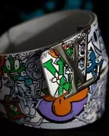 水晶和珐琅材质首饰诠释本系列蓟花图案。项链和戒指饰有硕大路易威登吊坠,镶嵌水晶的链条绘有蓟花图案,吊坠取材漆面水晶。路易威登花卉图案为多色宽幅友谊手链和项链平添魅力,手链和项链以链条或编织攀岩绳相连。折纸皮革“纸帽”呼应本系列童年主题。印花尼龙材质的风帆呼应降落伞面料,可打造纱笼式围裙造型。手工钩针围巾或采用本系列多彩色调,或基于足球围巾图案进行再创作。滑板与LV 漫画图案共同呈现于包袋。绘有太空天线图案的软垫尼龙帽,呈现卡通印花或块状色彩。树脂材质玩具串珠用以装饰腰带、鞋履、鞋带和帽绳。