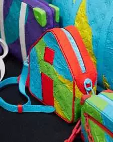 物状包袋推出多种款式:货车手袋,取材番红花色皮革或Macassar Monogram帆布;船形手袋,取材白/蓝皮革,呼应折纸纸船;幸运饼干手袋,取材饰有迷你Monogram印花的棕黄色皮革;钻石手包,取材全息色彩鳄鱼皮革或深红色底纹PCV;三明治盒手袋,绘有“Freshly Baked”字样,采用蓝紫或黄绿皮革;盆栽仙人掌手袋,取材Monogram皮革,缀有3D仙人掌皮革图案。Playdough系列饰有硅胶涂层,打造橡皮泥般的软糯效果。融蕴荧光色调和原色,推出多种款式:Keepall旅行袋、Sac Plat手袋、Sirius公文包、大尺寸Christopher双肩包、路易威登屋形邮差包和Cotteville硬箱。Playdough Monogram系列采用多重涂层工艺,以橡皮泥色调描绘路易威登标识。推出多种款式:Keepall旅行袋、Christopher双肩包、Cruiser双肩包、Cruiser邮差包、大尺寸腰包、mini Soft Trunk链条包和配有保温杯的单肩机车包。推出多色可选:粉色搭配蓝绿色,黄蓝和黑蓝配色。