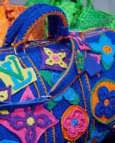 Comics手袋取材帆布,全副排布多彩漫画图案,并饰有字母形状的地址名牌,可为客户定制姓名首字母。推出多种款式:Keepall手袋、Keepall 25手袋、Sac Plat手袋、双口袋背包、Sirius 70旅行袋、迷你版Soft Trunk链条包、大尺寸腰包、Cruise邮差包以及印有路易威登新桥回邮地址字样的信封包。鳄鱼皮革包袋推出霓虹绿Keepall旅行袋、橙色Lock It手袋、配备保温杯的紫色机车包袋、荧光黄mini soft trunk手袋和霓虹绿竖款Soft Trunk链条包。钩编Monogram花卉系列通体采用钩编工艺和马达加斯加手工编织工艺,并缀有钩编贴饰。推出Keepall旅行袋和竖款 Soft Trunk链条包。Flower Field系列灵感源自路易威登用于存放Cotteville硬箱和首饰盒的专用保护袋。取材档藏米色棉质帆布,缀有簇绒和手工刺绣印象派花卉图案。Marble系列呈现Monogram图案公文包,由擅长城堡内部大理石修复的专业雕刻师雕琢而成。搭配钯金材质手柄,内部饰有耀眼LED灯。
