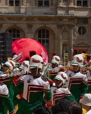 路易威登2023春夏男装秀上,配乐缓缓响起,随后电影序幕《不同寻常的数学》徐徐开启,现场表演者翩然而至,步入秀场。电影配乐由Sun Ra Arkestra指导,逐渐过渡到Marching 100的现场表演。这支成立于1946年的游行乐队来自位于拉哈西市的佛罗里达农工大学,与一位特邀嘉宾共同呈现悉心编排的演出效果,后者表演了四首原创曲目。时装秀的摄制人员名单和曲目列表将在系列∞的第二版手册中公布。
