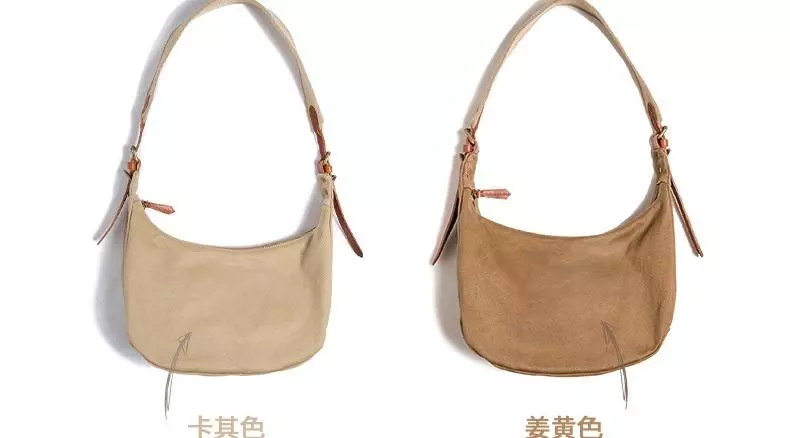 这款饺子包的面料采用了24盎司的重磅全棉斜纹破卡帆布,手感厚实,耐磨性强,不论是卡其色还是姜黄色,都能在每一条竖纹中看到复古的气息;