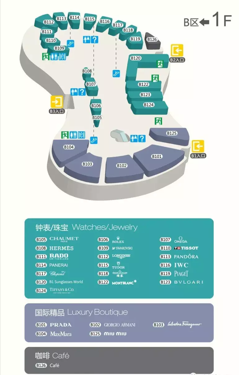 B座精品区的1层和2层引进了诸多国际一线经典知名品牌,包括了手表、太阳镜、箱包、首饰、服饰等众多种类。先对比火爆的香化区这里显得清净的多,但是淘一些大牌的经典包包、手表或者实用的太阳镜,都是非常不错的选择。