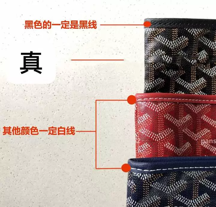 第三点:看包身走线的颜色。Goyard黑色包的配色的线都是黑色的;而其他颜色的包走线都是白色的,这一点是非常容易确认的点~