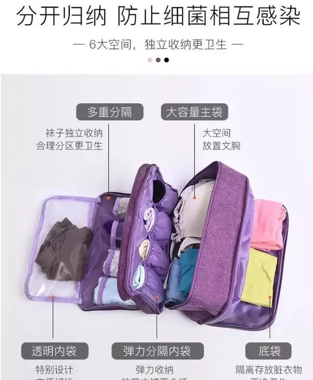 不仅全部都能塞进去,这个收纳包内含6个独立空间,袜子、内裤、内衣全部独立收纳,每件袜子和内裤都有独立的收口空间,还有放文胸的大空间,哪怕脏衣服都有独立的地儿,跟其他没穿过的干净衣服完全隔离,防止细菌相互感染。