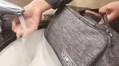 小编也不信啊!该不会是乱吹牛吧?小编作为一个愿意为大家负责任的小编,拿着收纳包了洗手间,直接用手捧着水往包上倾倒,结果就跟水遇到荷叶一样,半滴水都无法浸入,太神奇了!