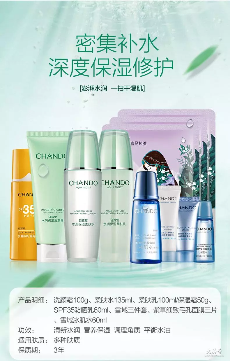 2、自然堂水润护肤品套装:这次的试用套装不仅有洁面水霜,还有一盒面膜和一套试用小样,水润保湿的套装也刚刚好适合这个季节。清新自然绿的套装,夏天看着就舒服小样也是一套,可以在享受水润保湿系列的同时试用自然堂另一个系列的产品洗面奶真真是非常好用啊!性价比超高的一款!洗的干净不会拔干。柔肤水打底用补水效果非常好,成分自然,用起来放心。霜夏天用的话对油皮不够友好,但是绝对是干皮的福星,香味淡淡的,很心水!自然堂的面膜也是我一直用的一款面膜,精华液多,面膜纸也很薄,补水效果超级好,非常推荐。