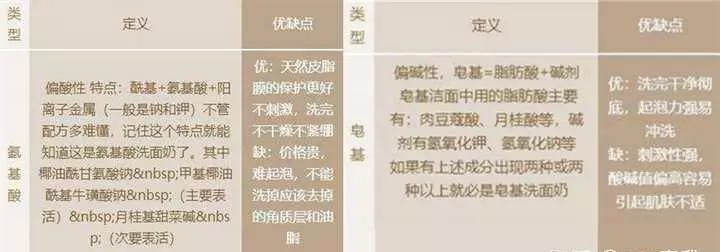 氨基酸洁面产品:呈弱酸性,清洁能力一般,但是质地温和,洗完之后面部会出现紧绷感。皂基洁面产品:呈碱性,清洁力和控油能力都很强,但是使用感相对较刺激,洗完之后会出现明显的紧绷状态。