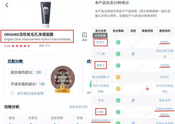 小编在真我APP里面查询成分的时候,发现这款也含有【碳粉】的成分,同时还有【木薯淀粉】和【高岭土】,都能作为吸附剂来吸附油脂垃圾,但是根据含量占比排行来看,吸附力确实没有“泥娃娃”强。