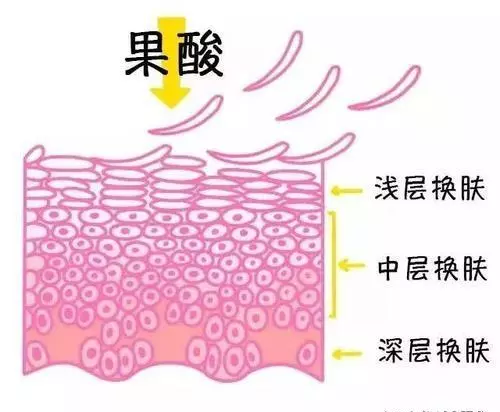果酸:果酸分为很多种,是利用小分子渗透的方式进入皮肤,促进表皮细胞的更新,使老化角质脱落。并且打开堵塞毛囊,溶解黑头、使痘痘脱落。同样可以治疗痘痘粉刺,但美白效果更加明显,且可以有效改善毛周角化(鸡皮肤)。