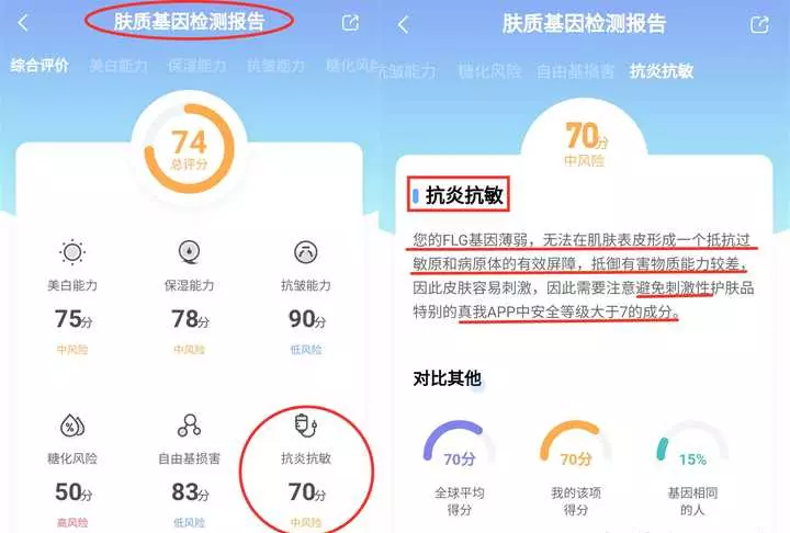 所以我就在真我APP上做了肤质基因检测,结果显示小编抗炎抗敏的分数有70分,这就代表我的肌肤敏感程度并不是特别严重,但也还是有一定的风险。