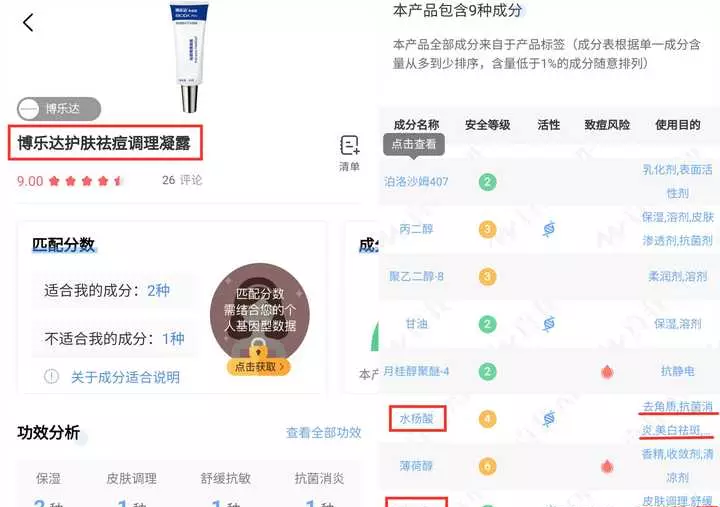 水杨酸:具有油溶性,可以疏通毛孔油脂垃圾,软化角质,治疗痘痘粉刺痤疮的效果更间明显。