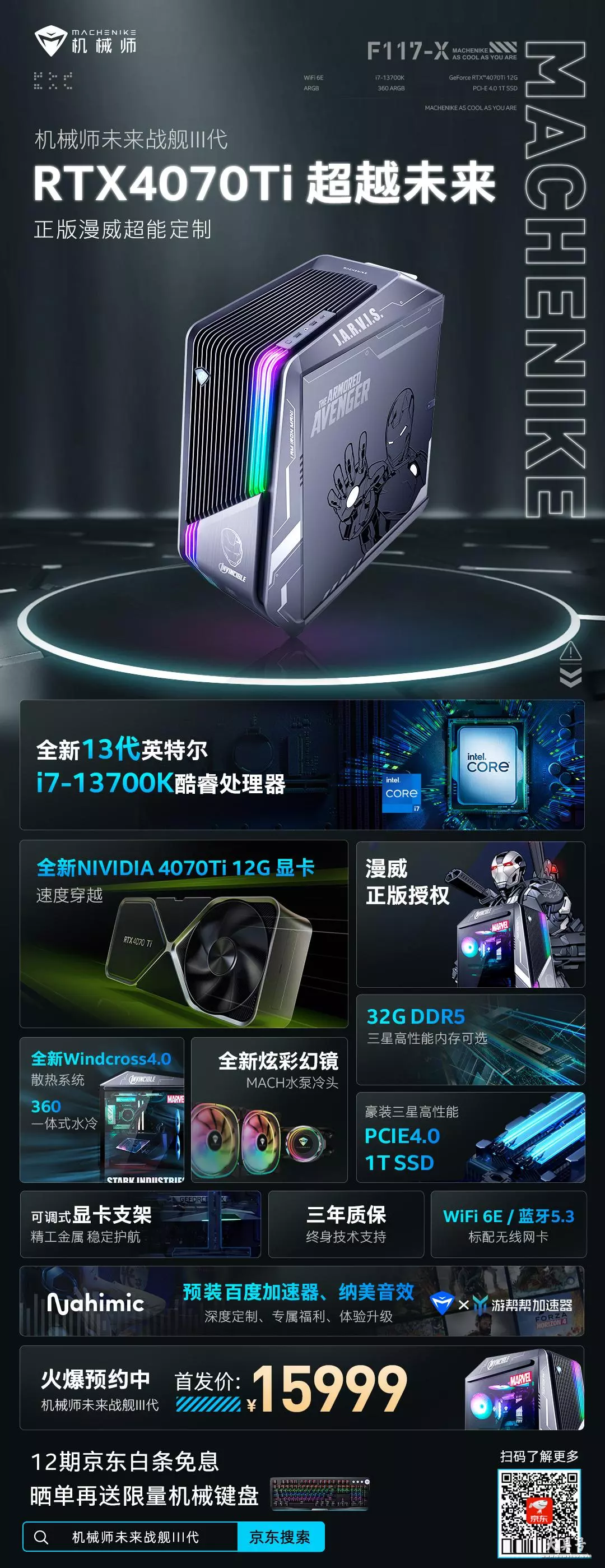 it之家 1 月 8 日消息,随着英伟达 rtx 4070ti 显卡的发布,一众新品也随着而来。例如机械师就推出了新款未来战舰 iii 代电竞主机,配备英特尔 13 代酷睿 i7-13700k 处理器、 rtx4070ti 的机型定价为 15999 元。这款机型除 i7-13700k 和 rtx4070ti 还配备了 z790 主板、32gb ddr5 内存、1tb ssd,采用 360 一体式水冷,支持 rgb 灯效,拥有漫威正版授权,支持 wifi-6e 网络和蓝牙 5.3。