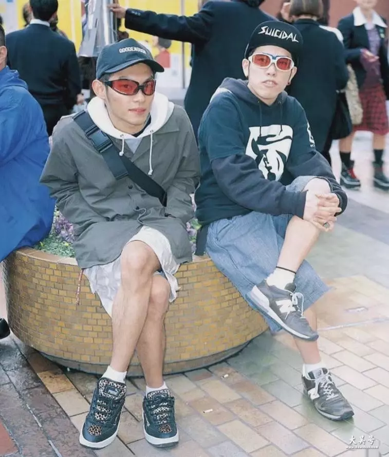 在传统的穿搭观念里,普遍认为小个子男生更适合素色穿搭,像经典的黑白灰,都具备很好的增高显瘦效果。而90年代的日本男生,十分偏爱高饱和度的色系穿搭,并利用各种极具视觉张力的时尚元素,来提升造型吸睛指数,豹纹、迷彩、印花,以及手表、项链、针织帽和潮袜,完全可以掩盖穿着者的身高短板。