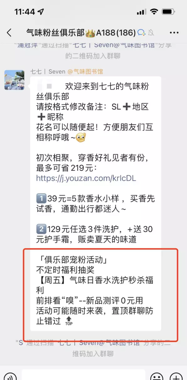 气味图书馆通过社群链接用户,增加产品的曝光和转化。下面以我添加的社群为例进行详细拆解。
