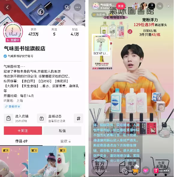 气味图书馆账号在抖音大概有4.1万+粉丝。视频内容主要是产品广告,明星推广。另外抖音每天在下午14点进行直播,由主播引导用户购买。