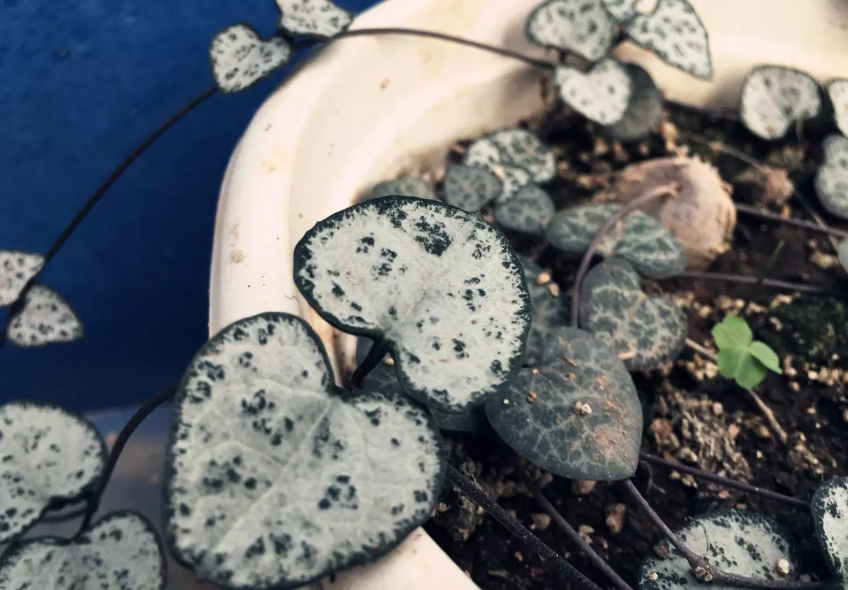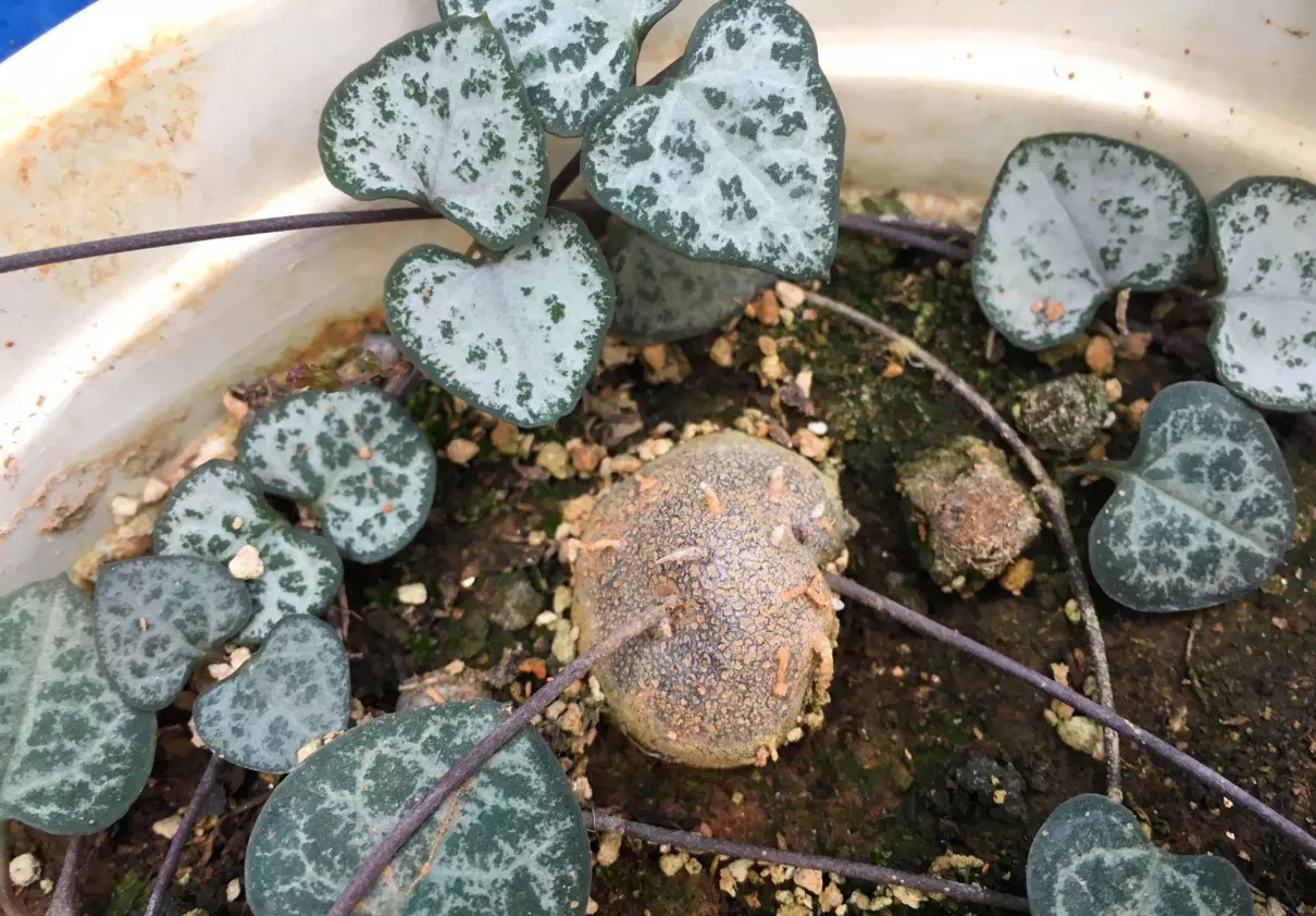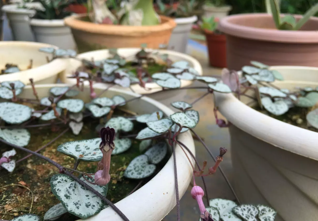 爱之蔓,萝藦科吊灯花属植物,原产南非,也算是多肉植物了,可以看到它的基部有个像土豆一样的原形块茎,有储存养份,水份的作用,看起来很像念珠,所以它也叫念珠藤,英文名就是RosaryVine,rosa也就玫瑰了。而且它也同样能开出花来,在夏秋之际,红褐色的花像个壶,想必里面是存了好多花蜜了,话说它并不容易结出种子,不过并不用担心不好繁殖它,可以通过用茎扦插生长,还有可以用那个块茎繁殖,和播土豆一样。