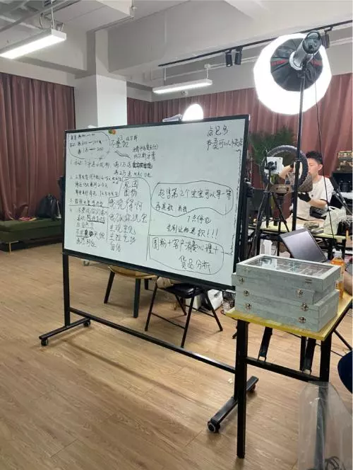 在主播的正前方,摆放着一个提字白板。除了优惠信息,还有一些对主播把控氛围的提示词: