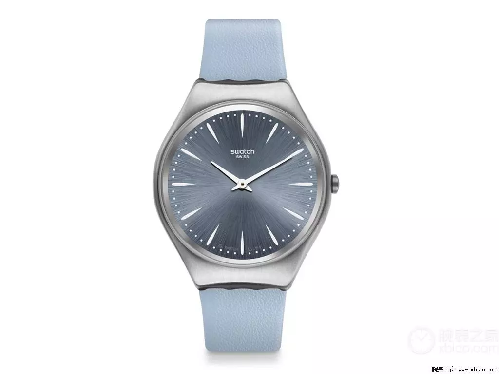 表款点评:这枚斯沃琪SKIN系列腕表,使用不锈钢材质打造38毫米表径表壳,海蓝色表盘上饰以放射性太阳纹路,精简的银色时标与指针更显大气。搭配奶油蓝色的真皮表带,既有成熟女性的大方内敛,又带有女生的俏丽可爱,千元的价格很值得入手一枚。