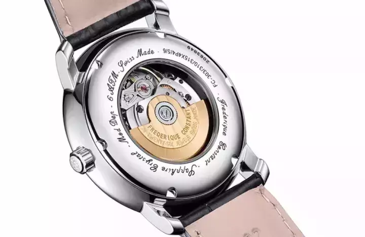 腕表搭载独家改良的FC-303机芯,背透设计的表底可以清楚窥见康斯登机芯的高级打磨技术,自动摆陀上饰有清晰的放射状太阳纹和日内瓦纹饰。表底的表壳上还用花体英文镶刻上了康斯登的名称以及产品的产地和编号。搭配上雅黑牛皮表带,经典针扣,适合任何商务场合穿搭。