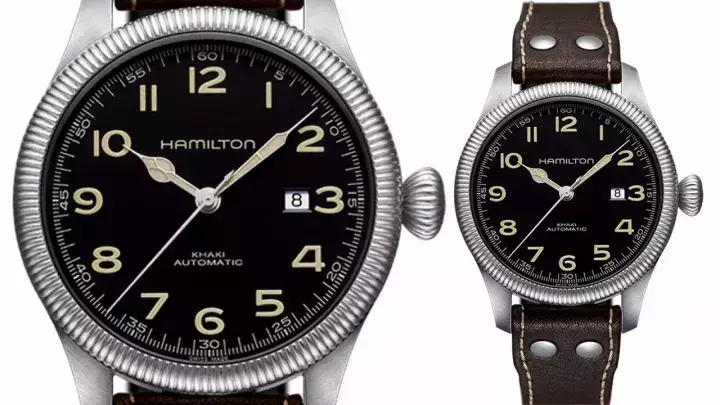 这款汉密尔顿将原有先锋系列的航空军表元素进一步“军事化”,将他归入纯粹军表的野战大系,并推出了45mm的强悍表款。蛇眼针、钱币纹、“洋葱表冠”、铆钉牛皮带等军表元素一应俱全,大气的尺寸将这些风格极力放大,霸气十足。新款采用透明底盖,让我们在为野战先锋外观惊叹的同时,能够欣赏精准运转的瑞士自动上链机芯。