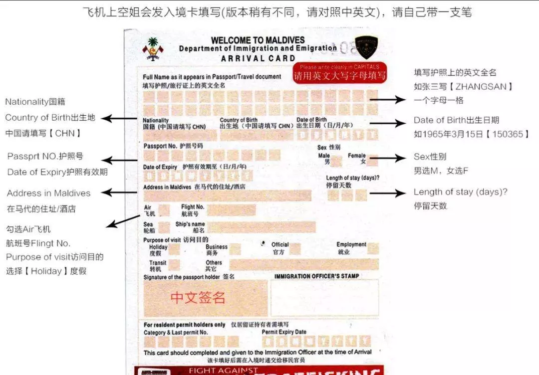 1. 抵达马尔代夫机场后,下机步行至入境大堂之移民局,填写入、出境及健康咨询卡(请自带笔);