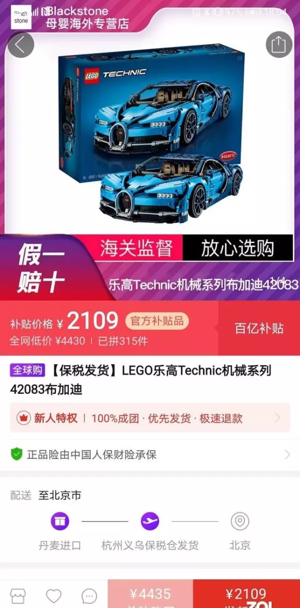 包裹在入关的时候,会有一定几率被海关抽检到。目前海关给布加迪的定价为2400元,税率15%,也就是说要交360元的关税,通关时间约为5-10天。不过,这些都省了,拼多多替你交税了,是不是很爽呢?