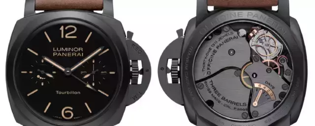 此外,PANERAI陀飞轮常常隐藏于表背,正面表盘仅可见“Tourbillon”字样以及随时间转动的圆点标记。比如PAM00396。