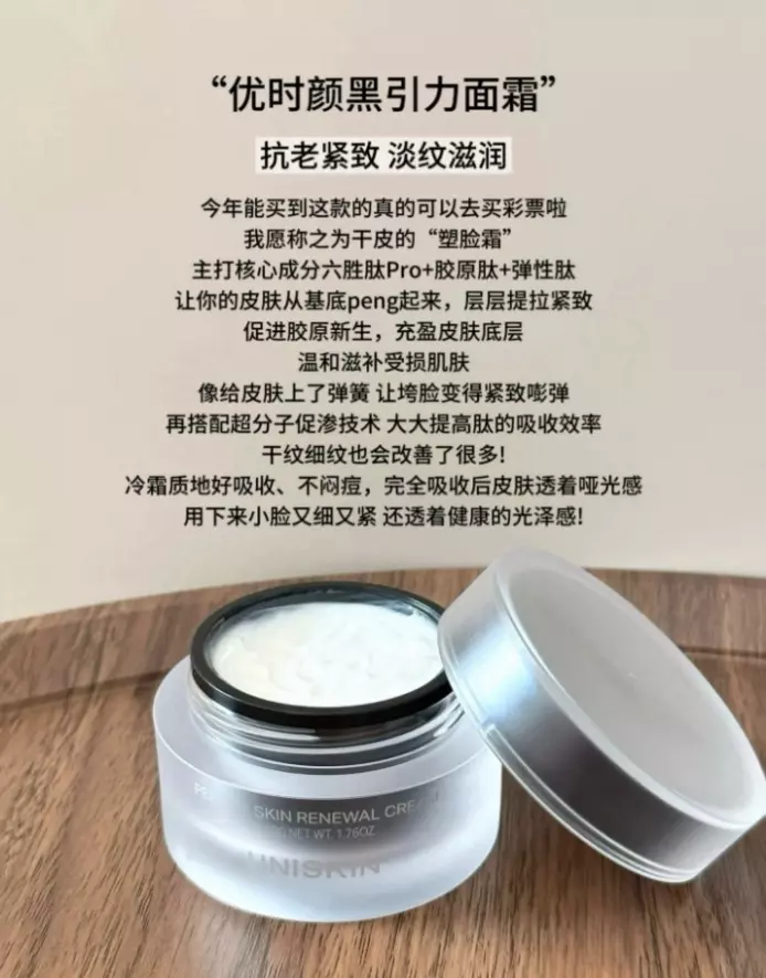 主要的作用是抗老紧致、淡纹滋润,今年能买到这款的真的可以去买彩票啦,我愿称之为干皮的塑脸霜,主打核心成分六胜肽Pro+胶原肽+弹性肽,让你的皮肤从基底peng起来,层层提拉紧致。