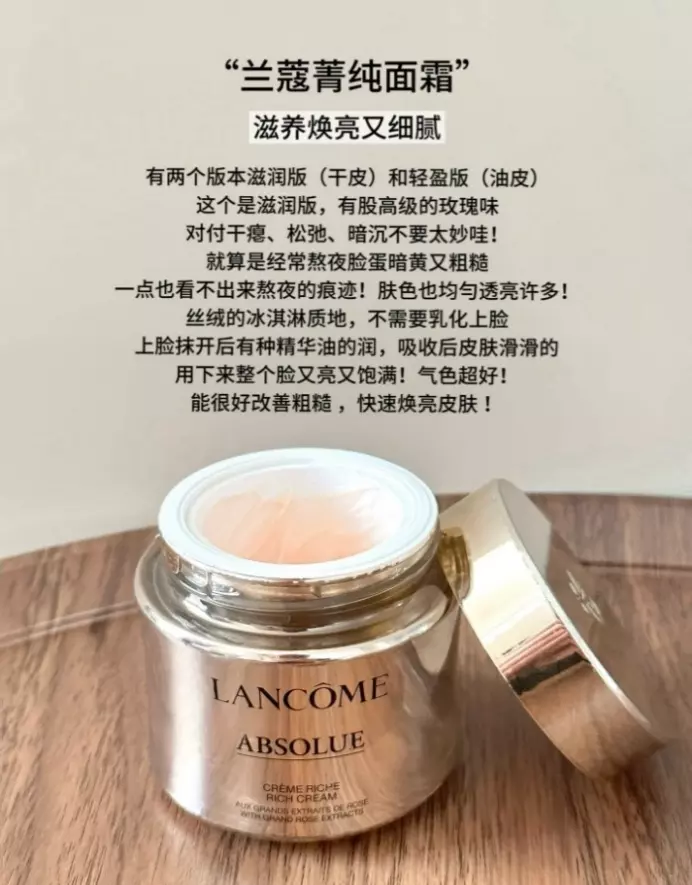 主要作用是滋养焕亮又细腻,有两个版本滋润版(干皮)和轻盈版(油皮),这个是滋润版,有股高级的玫瑰味,对付干瘪、松弛、暗沉不要太妙哇,就算是经常熬夜脸蛋暗黄又粗糙,一点也看不出来熬夜的痕迹。