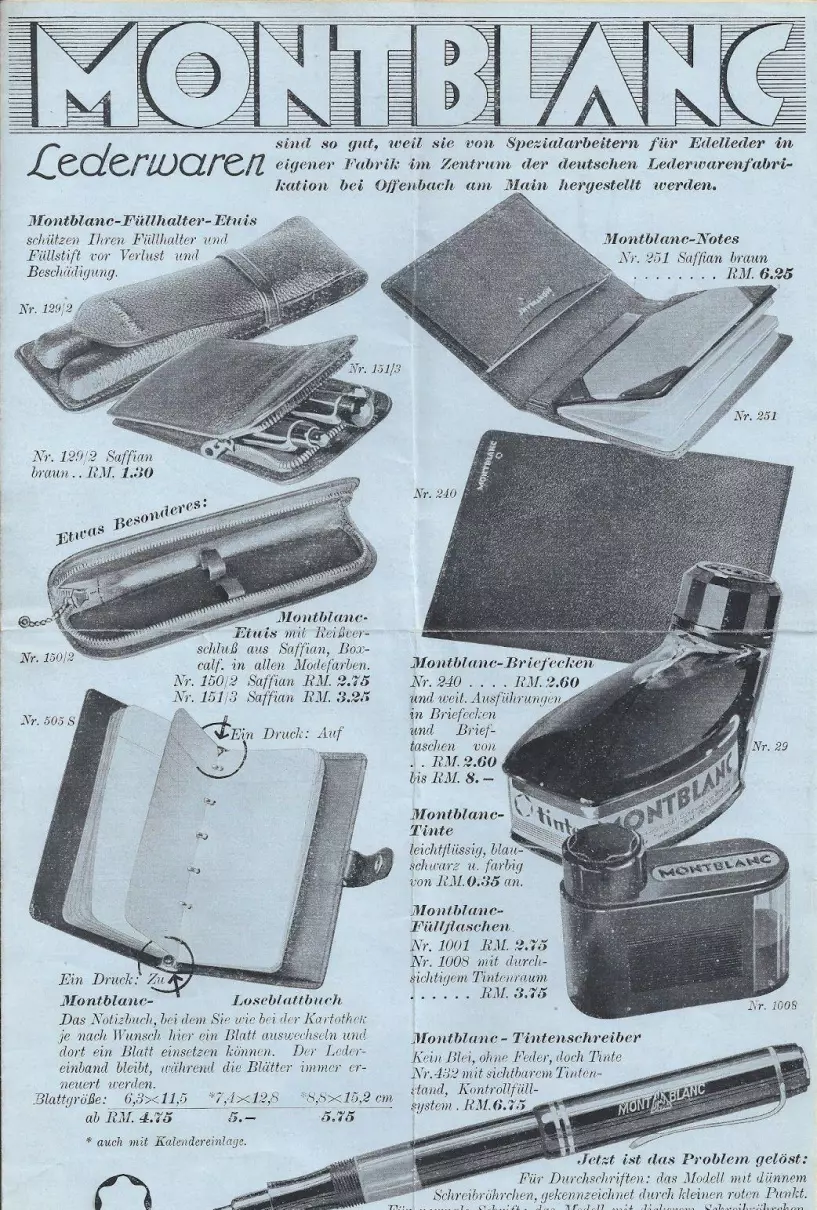 20世纪20年代,Montblanc 推出Meisterstück 钢笔系列,成为书写工具史上的重要里程碑。为了生产钢笔的皮具配件,Montblanc 首家皮具厂于1926年设立,坐落在以皮革工艺知名的德国奥芬巴赫小镇附近。Simplo 公司自1934年起正式更名为Montblanc Simplo GmbH 公司,次年收购德国奥芬巴赫的一家皮具制造公司,开始生产笔袋、笔记本和笔盒等皮具。