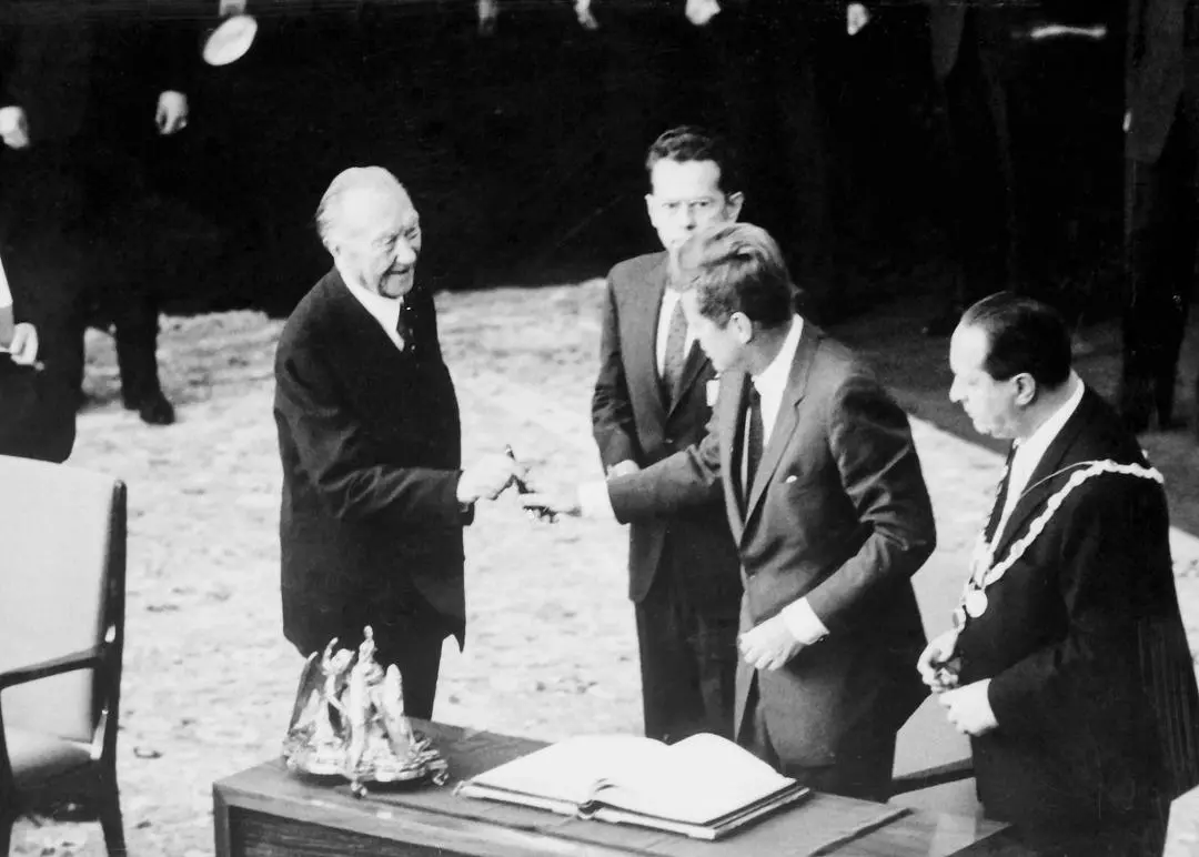 美国总统肯尼迪向联邦德国总理 Konrad Adenauer 递出一支万宝龙钢笔。