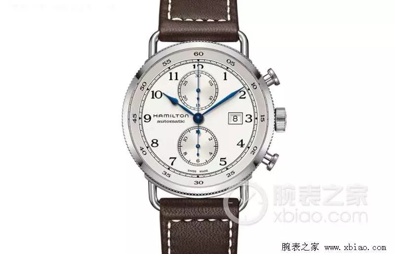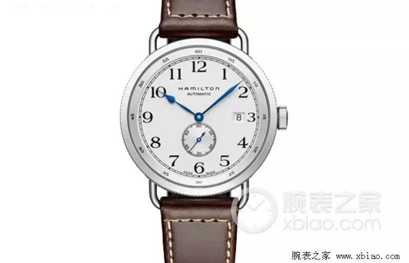 腕表点评:白底黑字蓝钢指针,阿拉伯数字刻度,3点钟位置日期显示功能,传承汉米尔顿卡其海军船钟系列的经典造型。两个小表盘表征了该款腕表的与众不同之处——计时功能,12点钟位置为30分钟计时显示表盘,6点钟位置为12小时累计计时显示表盘,简约风格之外有平添一种时尚运动风。刻度12被小表盘遮掩住了一半,倒有一种欲说还羞的意思,刻度6则干脆借机不出现了,有没有意境全看表主自己的想法了呦。搭载H-21机芯,动力储备可达60小时。