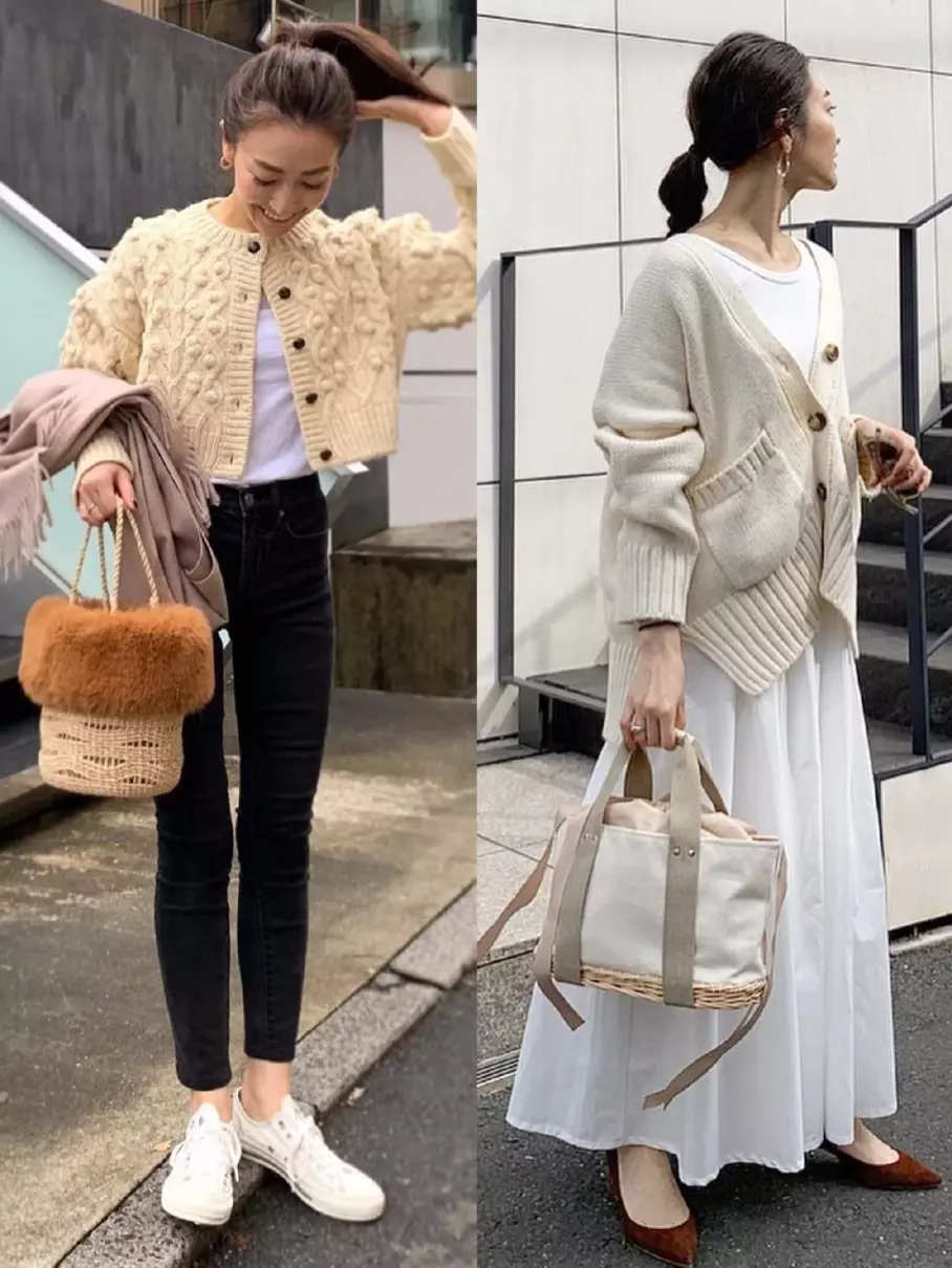 这两套是针织开衫的不同穿法,一个搭配小黑裤,用白色T恤和小白鞋点缀整体,简单中透着时髦,个性毛毛包包特别又俏皮,让人不自主地喜欢;