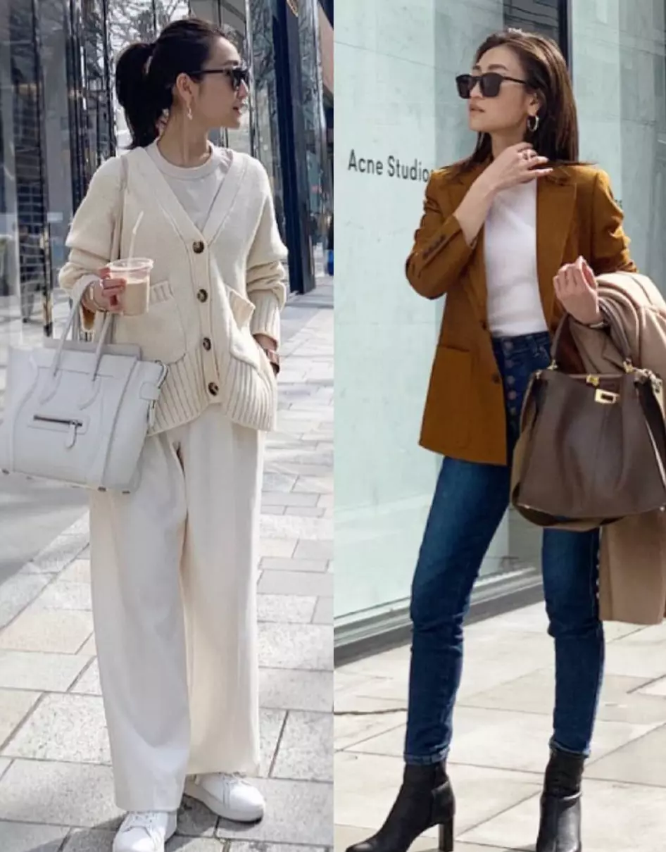 同样的宽松针织开衫,内搭白T和宽松的白色阔腿裤,是我们都想要的休闲舒服状态,全身白色系为主,明亮清爽,自带气场;右边的深卡西装对肤色有些不友好,因此内搭白T是最适合的选择,搭配蓝色牛仔裤,牛仔裤纽扣设计让它简单但又不普通,穿衣小技巧一眼可见。▼