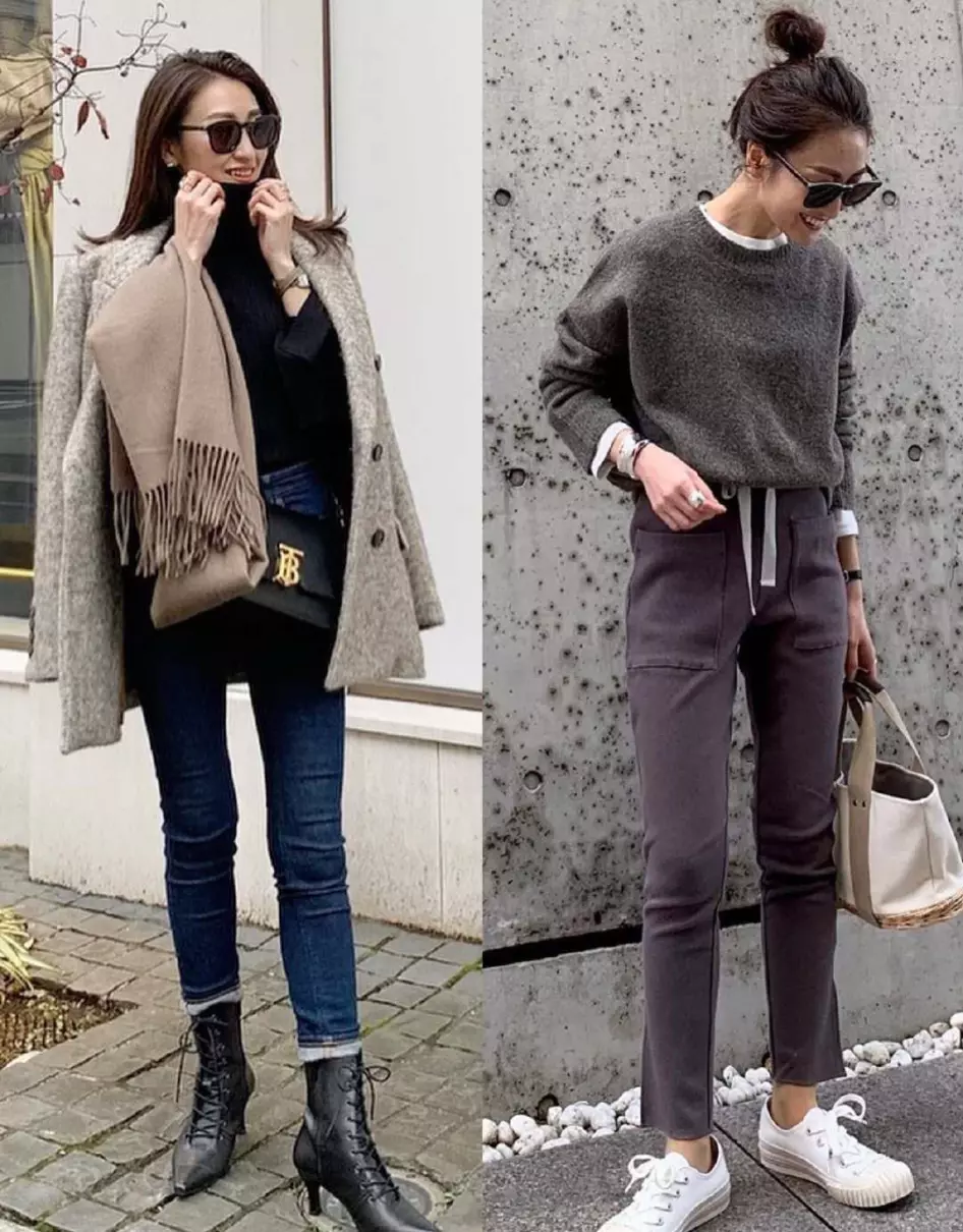 右边这套黑色针织开衫,内搭了一件白色T恤,利用叠穿打破常规,穿出时髦,牛仔裤和尖头靴子提升了质感和品位。▼