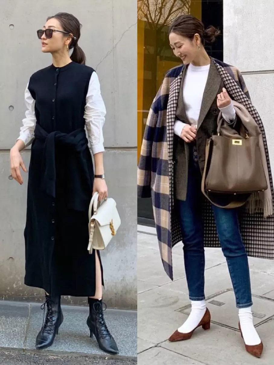 右边的格子大衣采用了叠穿法,内搭白T和西装,配了一条经典牛仔裤,是职场通勤常见的穿法。袜子+单鞋,这类穿法我们可能用的比较少,但在日式穿搭中最为常见,只要掌握好袜子的颜色和全身有协调就可以。▼