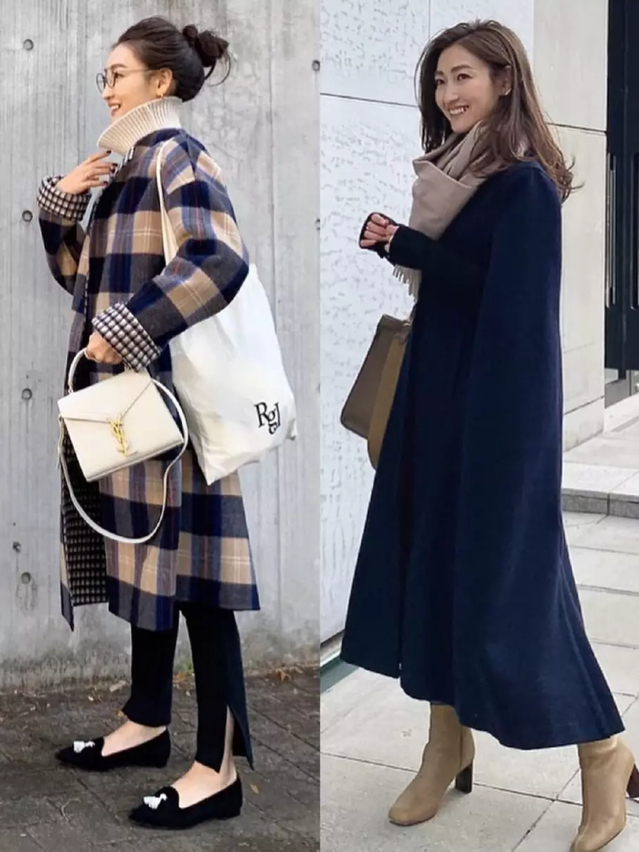 这两套是大衣搭配,两种风格都各有调性,特别舒服亮眼。左边的格子大衣内搭高领毛衫,配了一条黑色开叉裤子和单鞋,看着普通但细节处都是戏啊。