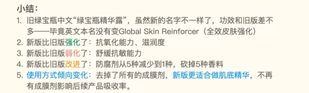 综合分析下来,我们会发现绿宝瓶新版在成分上做的改进,增强了抗氧化的能力,降低刺激性和过敏率。尤其是去掉成膜剂后,意味着绿宝瓶pro彻底成为一款肌底精华,有利于后续精华的叠加使用,也不用担心过于厚重,闷痘或者不吸收。