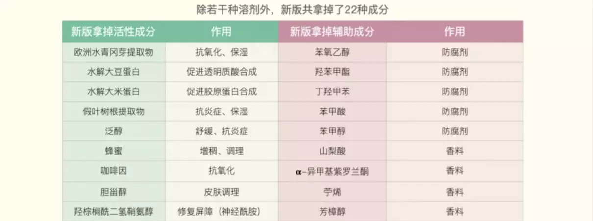 而最主要的是拿掉了五种防腐剂和五种香料,这些对敏感肌和皮肤刺痛者一直都是雷区,所以在新版的成分上更加温和。这也是新版和旧版最重要的区别,将精华像向肌底液过度。